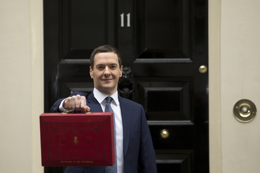 British Chancellor of the Exchequer George Osborne poses for the media with the traditional red dispatch box outside his official residence, 11 Downing Street in London, prior to unveiling the budget, Wednesday, July 8, 2015. It is the first economic budget since Britain’s Conservative party won the general election with an overall majority. (AP Photo/Matt Dunham)