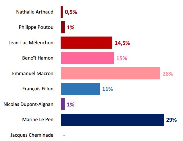 Η Λεπέν εντωμεταξύ εξακολουθεί να προηγείται του Μακρόν και πιθανότατα θα κόψει πρώτη το νήμα στον πρώτο γύρο, έχοντας ως πλεονέκτημα τη μεγάλη συσπείρωση των οπαδών του Εθνικού Μετώπου (Le Monde).